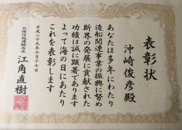 この仕事について30年以上が経ちますが、数年前、海上保安庁より「海事関係功労者」という大変名誉ある表彰をいただき今後の励みになりました。